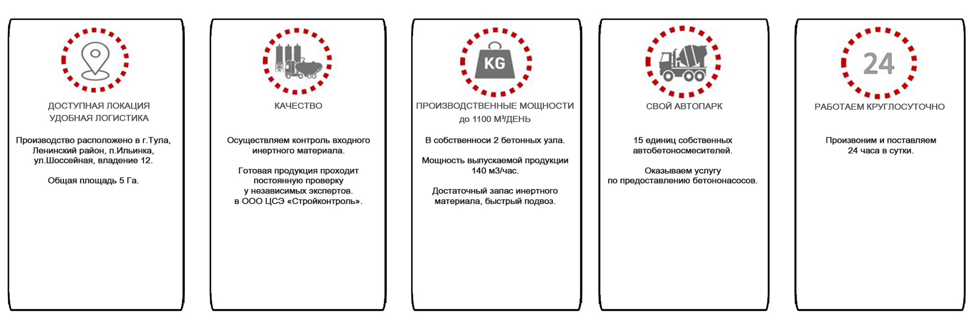 Мы следим за качеством, работаем только на проверенном оборудовании и с проверенными поставщиками. Производство бетона — наш основной профиль.